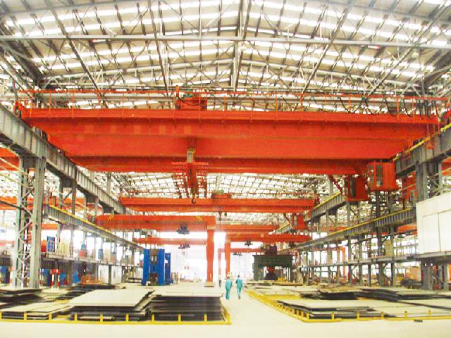 本起重機(jī)采用掛梁吊運(yùn)長(zhǎng)件鋼坯、板材、棒材、盤(pán)圓等物品,配置電磁吸盤(pán)或夾鉗或特殊群鉤進(jìn)行吊裝,主要由箱形橋架、起重小車(chē)、大車(chē)運(yùn)行機(jī)構(gòu)、司機(jī)室和電氣控制系統(tǒng)組成,配有停電保磁系統(tǒng)。起升機(jī)構(gòu)多采用單電機(jī)、雙減速器、雙卷筒布置,呈雙吊點(diǎn)形式。掛梁布置形式分垂直于主梁或平行于主梁兩種。其余形式與QD型起重機(jī)相同。